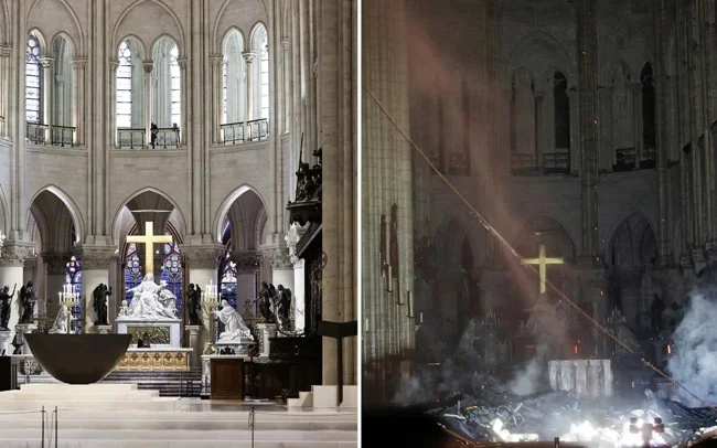 The fire in Notre Dame Cathedral occurred on April 15, 2019. It was not extinguished until the morning of the next day. Then the spire collapsed and the roof burned down, and the interior decoration, organ and gargoyles on the facades were damaged.