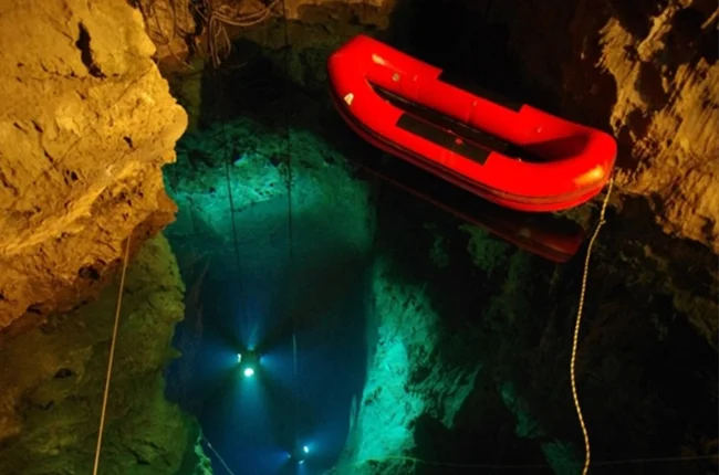 This impressive cave system boasts waters from a lake that is considered one of the clearest on earth, and some lovely inhabitants.