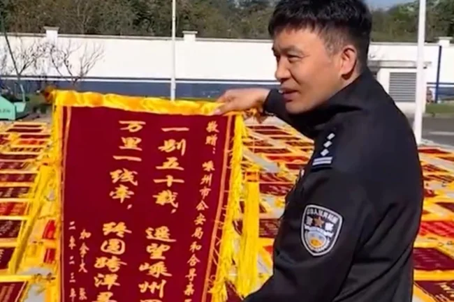 In eastern China, police officer Shang Chaoyang, who has dedicated 16 years of his life to helping families find missing relatives, has turned his office courtyard into a colorful spectacle. He has hung more than 300 thank-you pennants on the basketball court that he has received from families reunited thanks to his efforts.