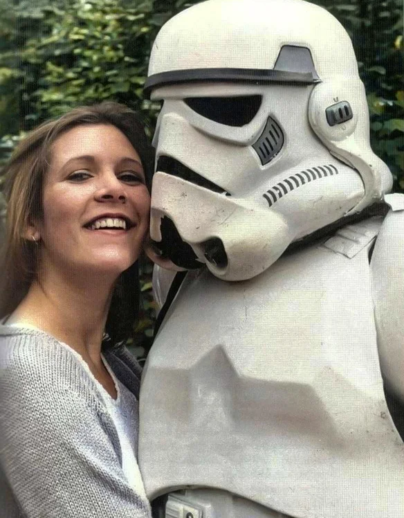 Carrie Fisher with a stormtrooper on the set of Star Wars. Episode V, 1979.