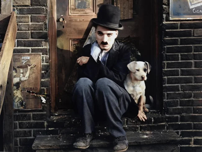 A still from the filming of "A Dog's Life". Charlie Chaplin and the mongrel Mut, 1918.