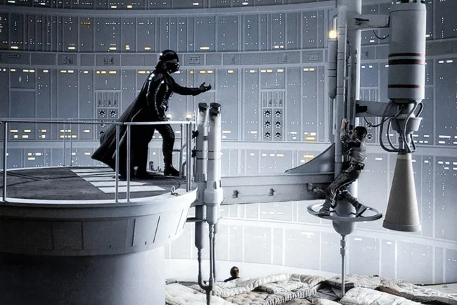 Insurance from a pile of mattresses on the set of "Star Wars. Episode V", UK, 1979.