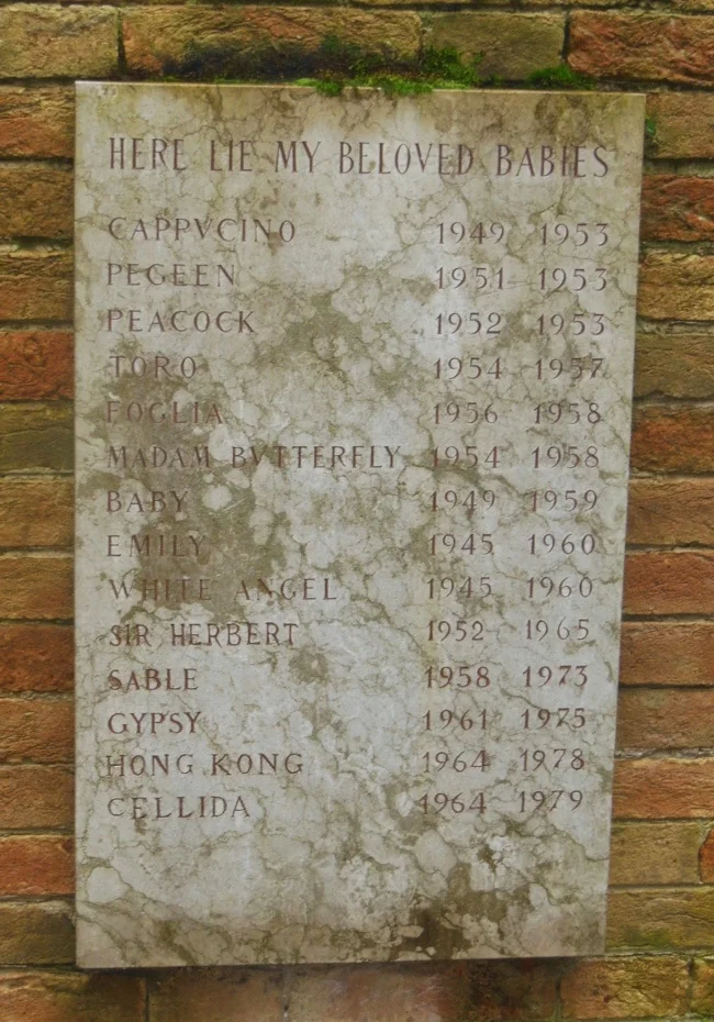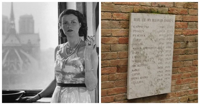 It wasn't one of her many lovers or her ex-husband, the artist Max Ernst. Peggy asked that Cappuccino, Peacock, Peguin, Thoreau, Foglia, Madama Butterfly, Baby, Emily, White Angel, Sir Herbert, Sable, Gypsy, Hong Kong, and Chellida be buried with her so that they could spend the afterlife together.