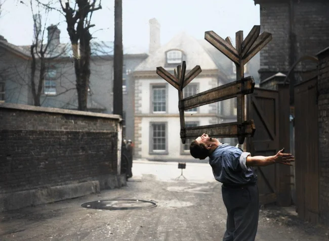 Joe Smith, a strongman blacksmith from Gloucester, holds a roadwork fence in his teeth. England, 1936.