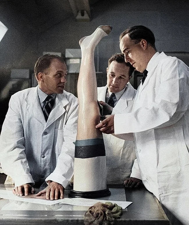 Nylon stockings undergo rigorous testing in the Mark's and Spencer's textile laboratory, 1955.