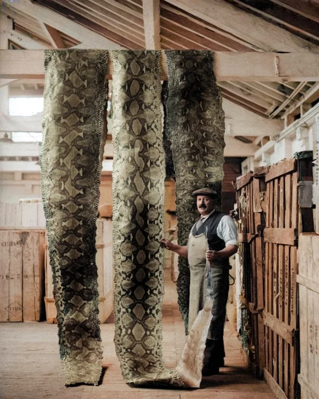 Drying skins in a warehouse in the port of London, 1930.