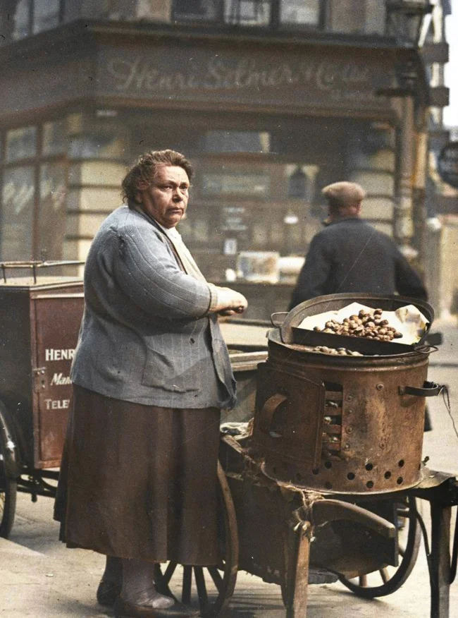 A vendor of roasted chestnuts in Soho, London, UK, 1935.