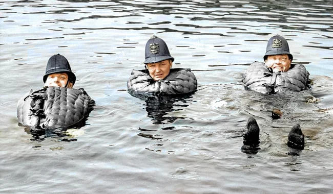 Three police officers test life jackets in the Port of London, 1930.