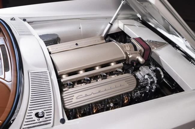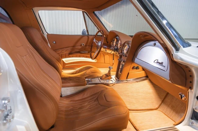The hardtop restomod is based on a 1963 car, while the donor version with a convertible top rolled off the assembly line four years later. Both sports cars have restored bodies, painted in a special shade of white, and interiors trimmed with leather, mahogany, and chrome. New sports seats, climate control systems, and electric windows have been installed.