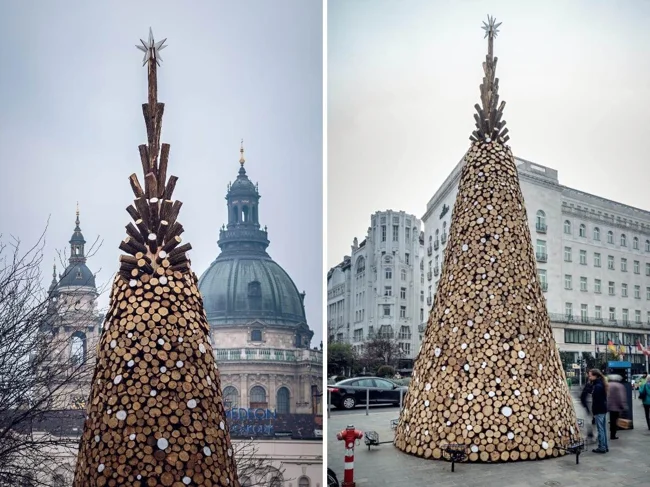 An 11-meter-tall wood Christmas tree was assembled from 5,000 logs in one of the central squares in Budapest.
