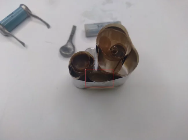 Pay attention to the place in the photos below that I marked with a red rectangle. This half-cylinder of foil is the place of contact of one of the plates of this capacitor with the caps on the terminals of this capacitor.