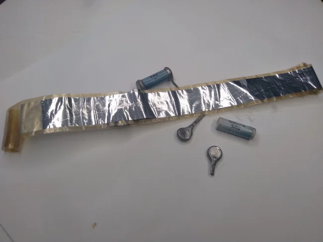 Let's move on directly to the working part of the KGB-I capacitor. It consists of two strips made of aluminum foil, separated by a gasket made of capacitor paper. Then this entire structure is twisted into a tube and placed in a ceramic case.