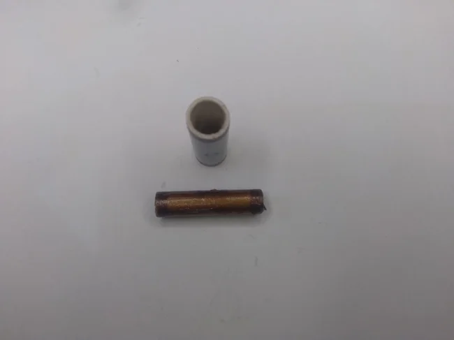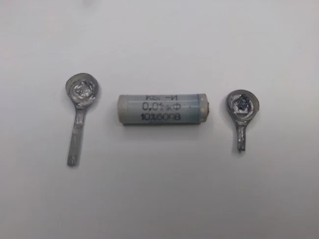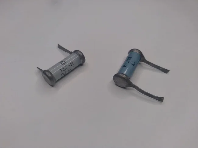 Externally, the capacitor design is a ceramic cylinder with terminals on the sides. The case is painted blue, as you can see in the photo, the color of the cylinder is different for two capacitors, perhaps due to heating during operation or due to exposure to ultraviolet radiation. The terminals are made in the form of caps. The caps are made of brass and then tinned.