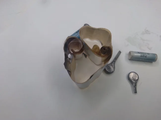 All the free space inside the capacitor is filled with oil. In my case, the oil had an unpleasant burnt smell, like waste oil. In general, when disassembling Soviet radio components, you need to be careful, instead of oil, they may contain acids or toxic substances.