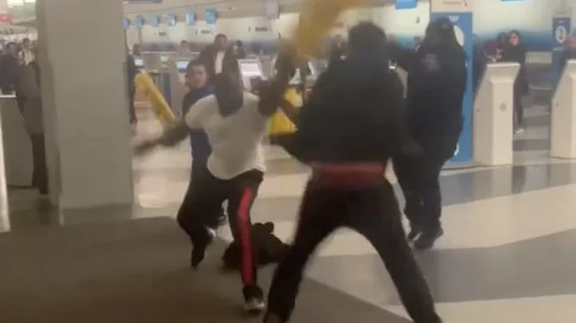 A fight broke out at an airport in Illinois, USA. Four men were hitting each other with signs saying "Caution, wet floor" and were caught on video.