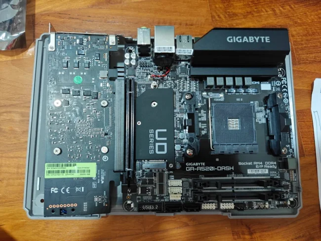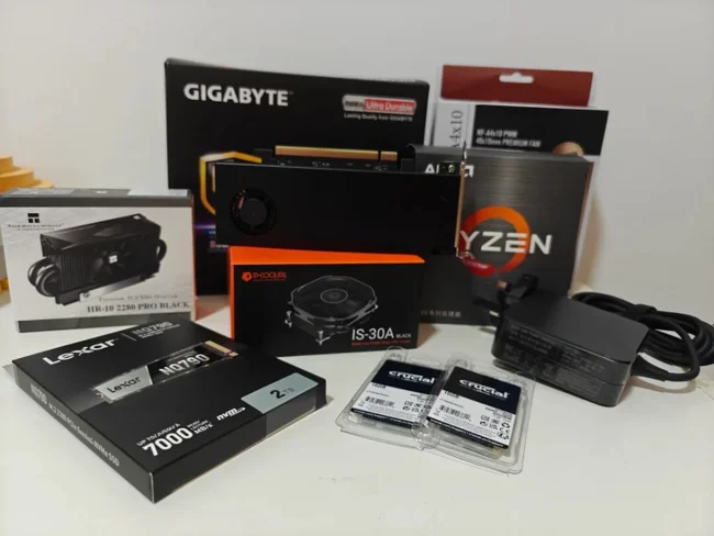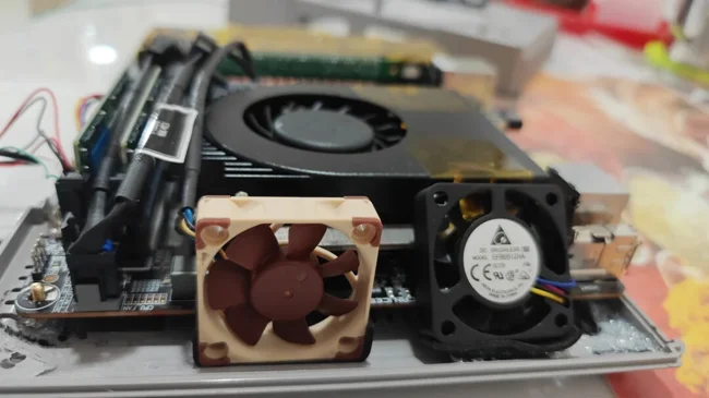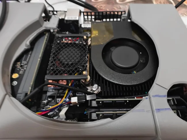 He built the build using a Gigabyte A520i Dash DC motherboard, a Ryzen 7 5700X processor, 32GB of RAM, a 2TB Lexar 790 SSD, a server cooler, and a modified GeForce RTX 4060 Mobile GPU. The build is further cooled by three fans.