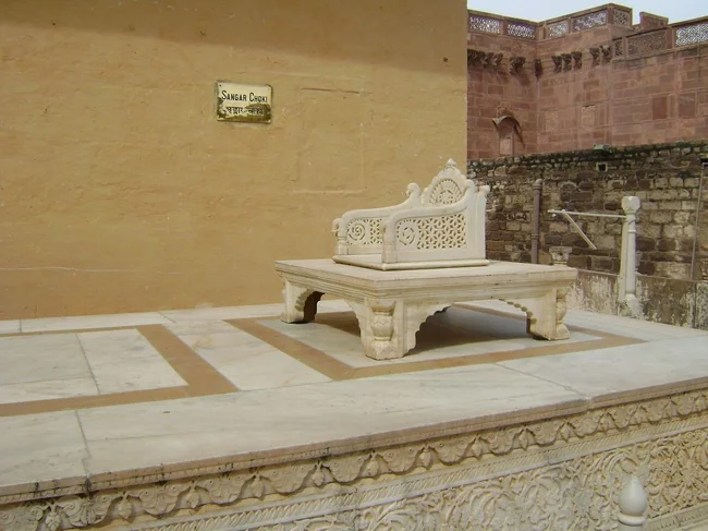 There was only one way to appease the saint, and the monarch was not about to let it slip. To reverse the curse, one of the kingdom's citizens was asked to give his life. That man was Rajaram Meghwal, who was buried alive among the bricks and mortar of the fort in 1459. His sandstone memorial was built on the fort's premises, and his family continued to be supported by the state for generations.