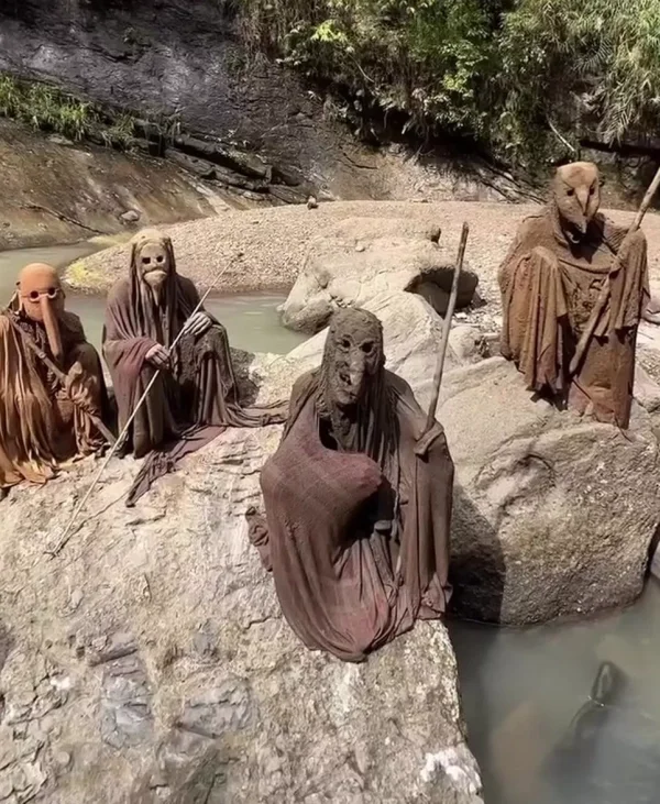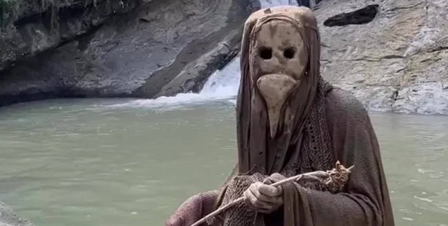 The footage, accompanied by Daniel's comments, shows him interacting with silent tribesmen dressed in unusual robes made of mud and clay. The tribe guards a sacred waterfall, which is considered an important place in their culture. Giant masks, imitating the images of spiritual birds with long noses and frightening expressions, only enhance the effect of mystery.