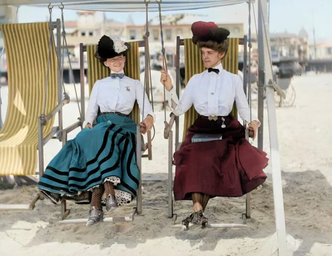 In the early 20th century, people wore dresses to the beach because that was the standard attire for women at the time. Knee-length bathing dresses and no corsets were considered nudity beyond the pale.