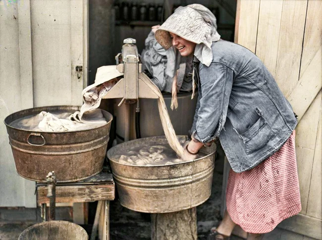 The washing machine is pretty used, but the missus looks cheerful. And, I must say, pretty. In the USSR, the "Belka" machine had the same spin.