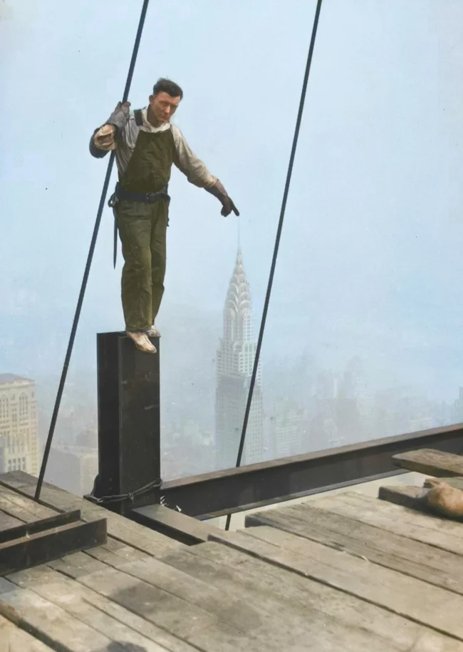 What I like about these photos is their shoes. This guy and everyone else you see in a similar photo is wearing leather-soled shoes. The soles don't have rubber treads. They're slippery, flat, and slide right over the metal hundreds of feet up in the air.