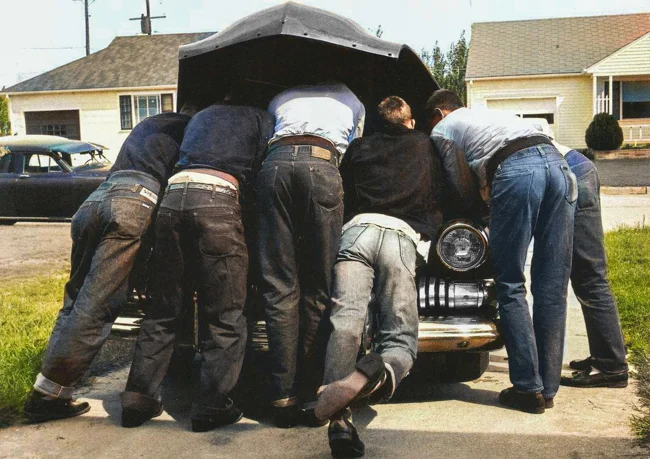 Teenager Kerry Grange (3rd from right) shows off her used 1951 Mercury to her friends for $365.