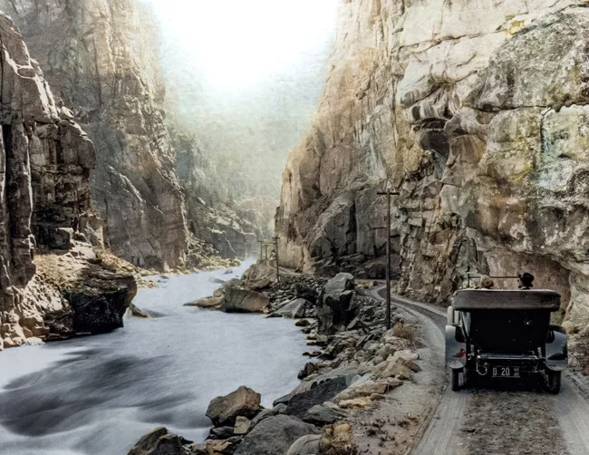 Tourists drive along a dirt road along the Yellowstone River, USA, 1920s.
