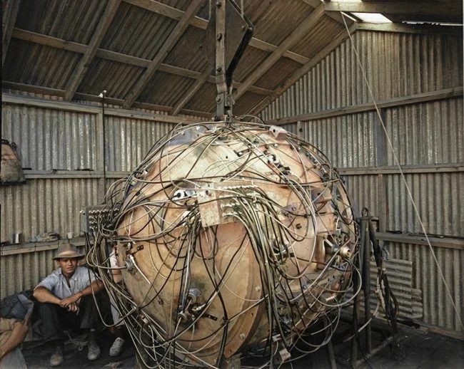Physicist Norris Bradbury sits next to the Gadget, a nuclear device created by scientists to test the world's first atomic bomb, at the Alamogordo Proving Grounds in New Mexico, 1945.