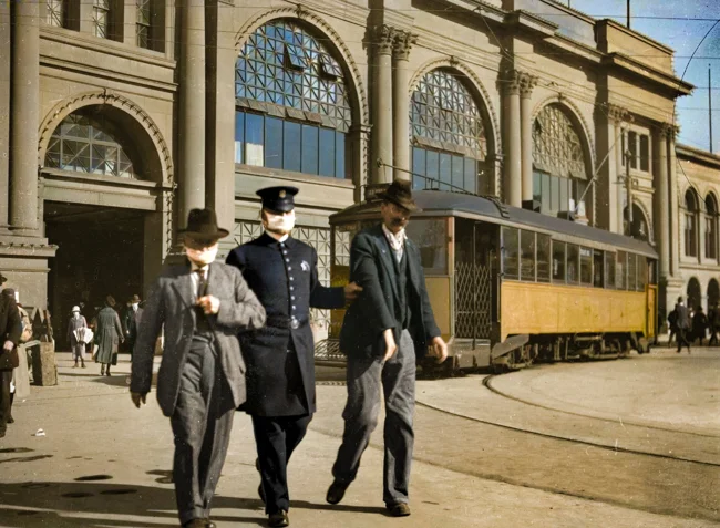 The Spanish flu pandemic. An officer grabbed one man without a mask. San Francisco, 1918.