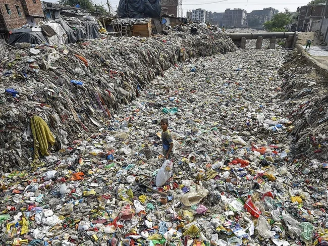 14. A boy collects recyclable items from a semi-dry sewer in Taimur Nagar in New Delhi