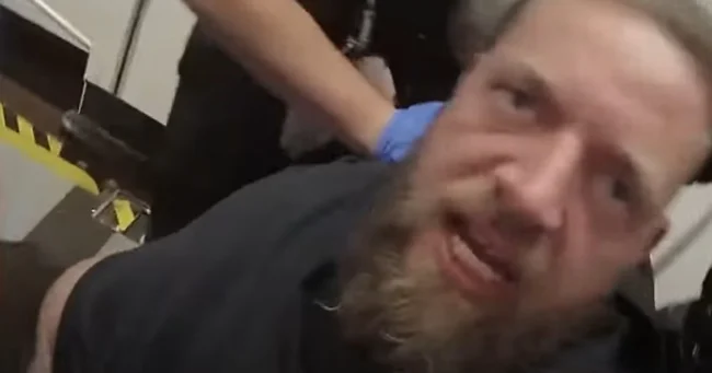 The footage shows the businessman sitting on the floor, resisting the police when they try to put him in a wheelchair.