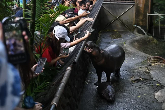 The photo shows Mu Deng and her mother. The popularity of hippos has grown so much that some "fans" threw various things into the enclosure to attract the animal's attention.