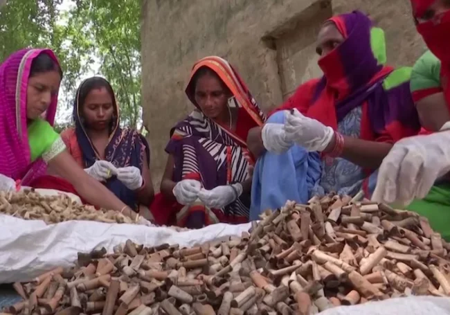 Women at the factory sort the collected cigarette butts so that...