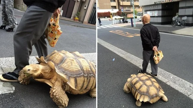 21. A man walks a turtle in Tsukushima