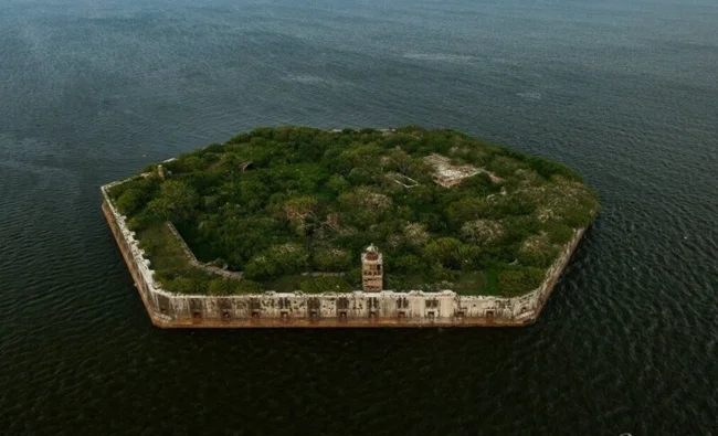 The small geometric island sat abandoned for decades, only briefly used as a firing range during World War II. Finally, in 1958, the fort was purchased by a Baltimore lawyer who did nothing with it. Over the years, the fort became increasingly overgrown, a small forest grew in its place, and the concrete structure gradually cracked and collapsed.