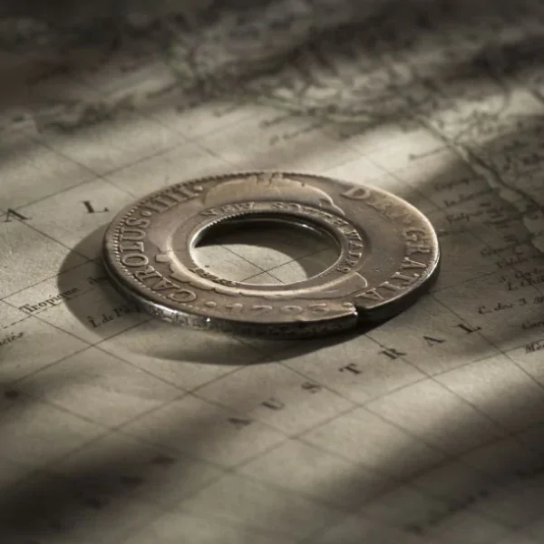 The coin was made in 1813 from a Spanish silver dollar of 1777, which was minted in Mexico during the reign of King Charles III.