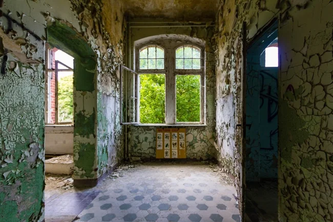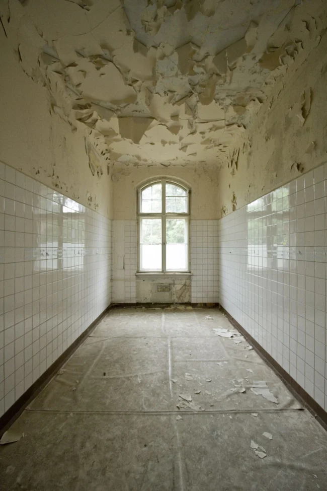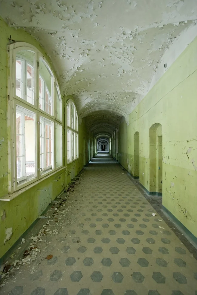 During the day, it is eerily quiet, but empty bottles, rubbish and burnt candle stubs are reminders that the hospital is not entirely abandoned. The place has become an unlikely mecca for everyone from Satanists to lovers on a romantic weekend, from urban explorers and architecture buffs to esotericists and late-night ravers.