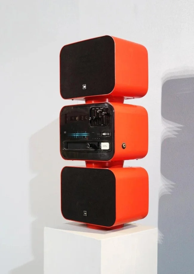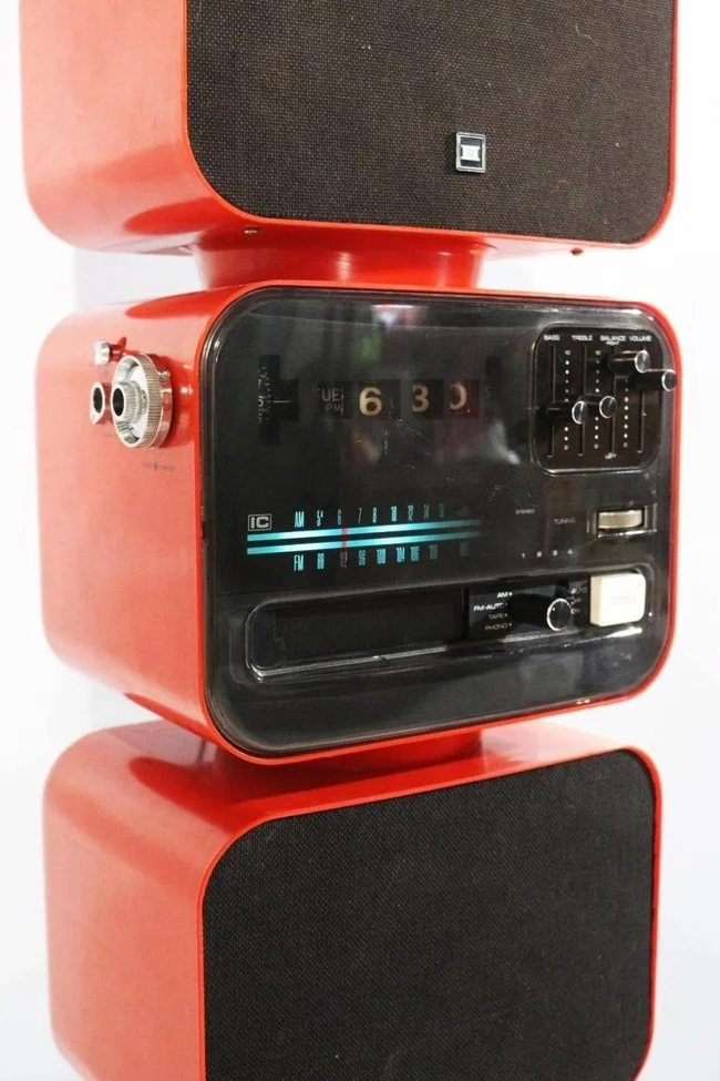 This Japanese audio system, released in the 70s, judging by the presence of an 8-track slot, is supplemented by an AM/ FM radio, a digital clock with an audible alarm (with reversible numbers) and two separate speakers.