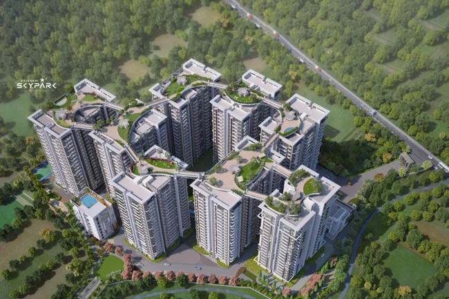A luxury residential complex in India with gardens and paths between the roofs of high-rise buildings. It is located in the city of Visakhapatnam, and additional amenities include a gym, swimming pool, basketball and tennis courts.