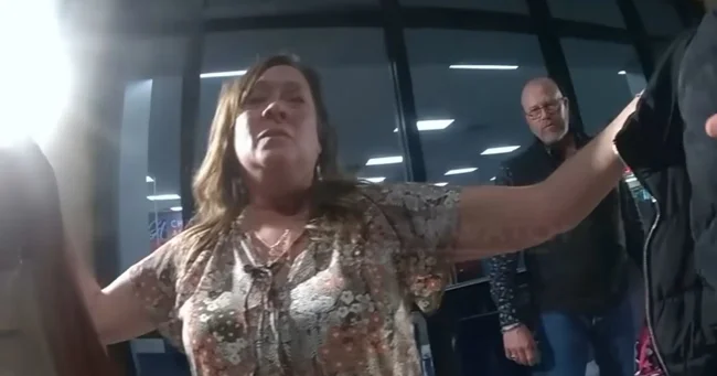 The sergeant repeatedly asked the woman to show her ID, but she refused and suggested "arresting her." The husband advised his wife to show her ID, but only angered her.