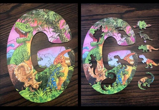 18. This puzzle forms the letter G, and the pieces are made in the shape of dinosaurs