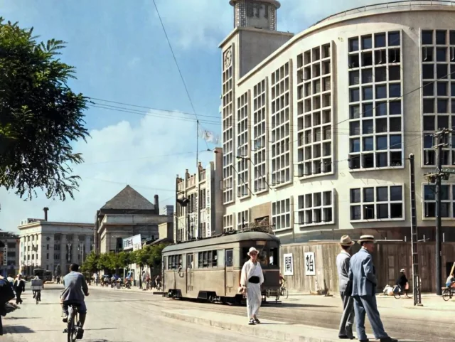 Street scene in the capital city of Keijo (also known as Seoul), Korea, 1944. The building in the foreground is a Mitsubishi department store.