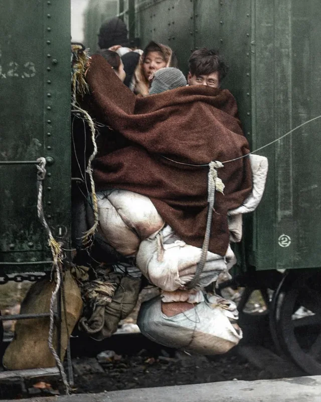 A family of internally displaced persons huddle between freight cars in Sinmak. North Korea, 1950.