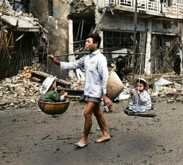 A Vietnamese refugee with his children returns to war-torn Hue, 1968.