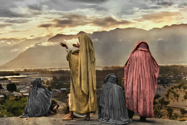 Muslim women pray at sunrise over the Himalayas in Srinagar, Kashmir, India, 1948.