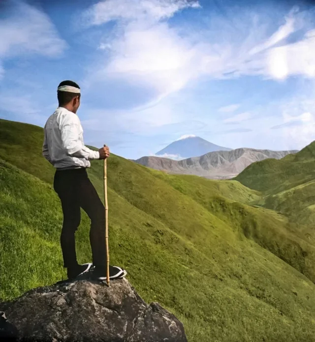 A Japanese man looks at the peak of sacred Mount Fuji, 1930.