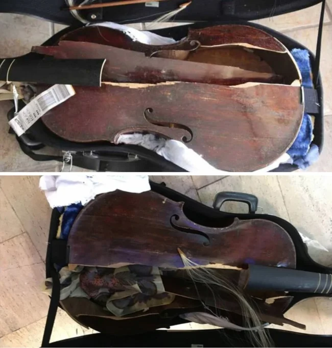 Look at the state my 17th century instrument was returned to me in after I was convinced it would be carried on board the plane by hand: it looks like it was run over by a car.
