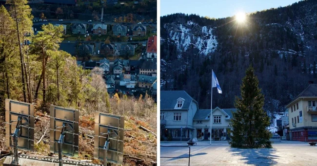 The city is surrounded by mountains, so it uses three giant mirrors to reflect sunlight during the six dark months of the year.