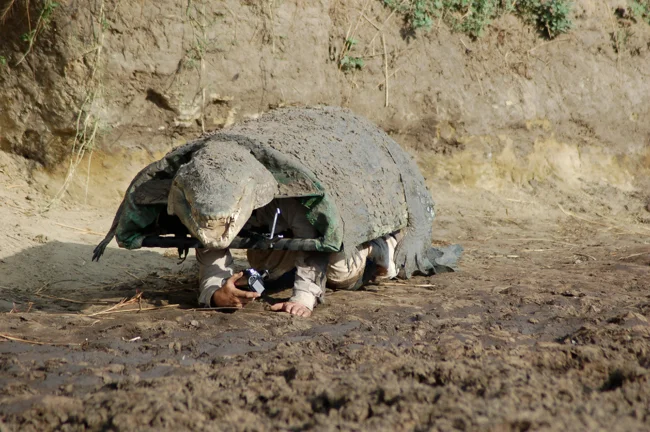 They decided to test the suit in Tanzania. It was a typical hot African day. The temperature rose above 40°C, and inside the suit it was all of 50°C. Barr climbed into the heavy structure and began his slow 60-meter journey to the group of predators.