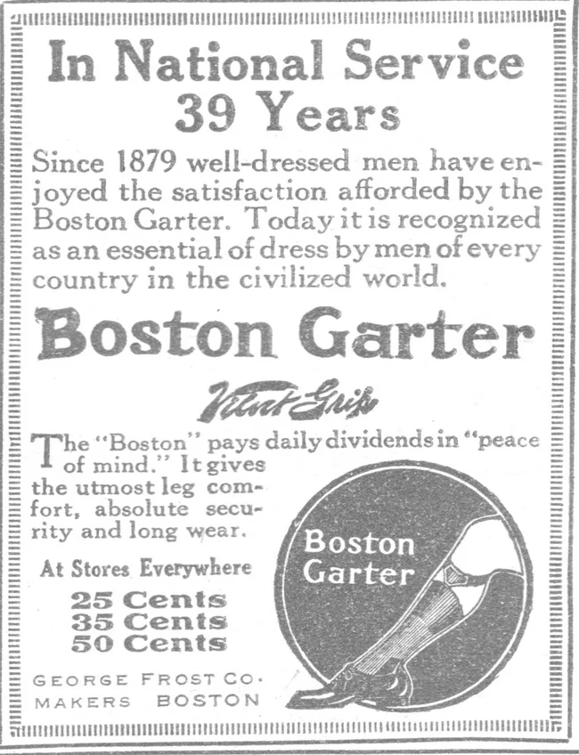 Since the end of the 19th century, Men started wearing socks that went just above their ankles. The problem was that socks were made without elastic bands. The photo below shows the solution to this problem. Quote from an advertising brochure: "Since 1879, well-dressed men have enjoyed the Boston Garter."